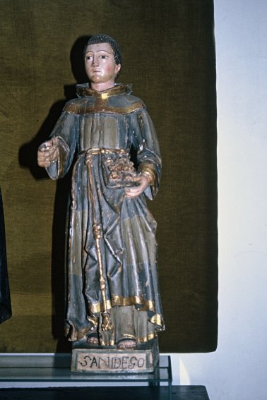Y allí fue donde encontré, en una visita que hice hace varios años, la imagen de san Diego cuya fotografía reproduzco. Aunque su iconografía no puede ser más clara, ya que reproduce el conocido milagro de las rosas, la inscripción con su nombre de la peana despeja definitivamente toda posible duda. Según creo recordar se trataba de una talla de madera policromada de pequeño tamaño y lo único que puedo comentar, ya que no me ha sido posible encontrar ningún dato, es que parece pertenecer a lo que los expertos denominan arte popular, lo que indica que procedería probablemente de alguna parroquia rural de la diócesis.