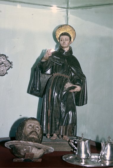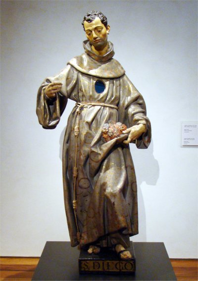 Finalizamos la visita a este importante museo con una pequeña talla que descubrí allí durante una visita; puesto que no figura en el inventario, carezco de información sobre su autoría y su procedencia. Tal como es habitual la figura de san Diego porta los atributos de las rosas y la cruz, aunque en esta ocasión no sujeta a esta última, como es lo habitual, sino que aparece plantada en lo que semeja ser el tronco de un árbol.