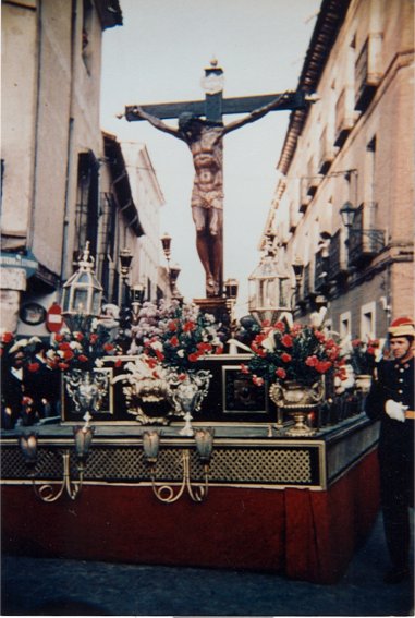 La última fotografía es más difícil de fechar, pero debe de corresponder a la época en la que el Cristo de los Doctrinos ya no hacía su tradicional Vía Crucis en torno a la plaza de Cervantes sino que participaba en la procesión general del Viernes Santo, ya que la imagen corresponde a la entrada de la carroza en la plaza de los Santos Niños probablemente para incorporarse a la citada procesión general. Esto permite datar la fotografía en los años finales de la década de los sesenta o los primeros de los setenta, ya que la procesión general comenzó a organizarse allá por 1966 mientras el Cristo de los Doctrinos dejó de salir en procesión, como ya quedó comentado, en 1976. Lo más interesante de esta foto es quizá el aspecto de la carroza, que como se puede apreciar guardaba un cierto parecido con la actual del Cristo de los Trabajos, que será la que provisionalmente se utilice este año para la recuperada procesión del Cristo de los Doctrinos.