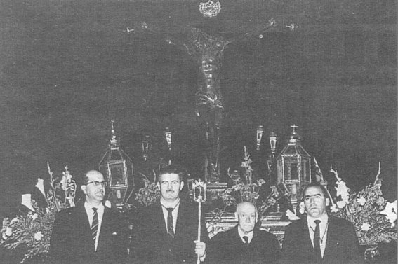 La tercera fotografía está fechada un año después, 1966, y no recoge la procesión en sí sino una vista de la carroza con el Cristo junto con los miembros de la junta directiva de entonces. Aunque apenas se aprecia debido a la oscuridad del fondo, la fotografía está tomada en la plaza de San Diego teniendo como fondo la fachada de la universidad.