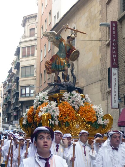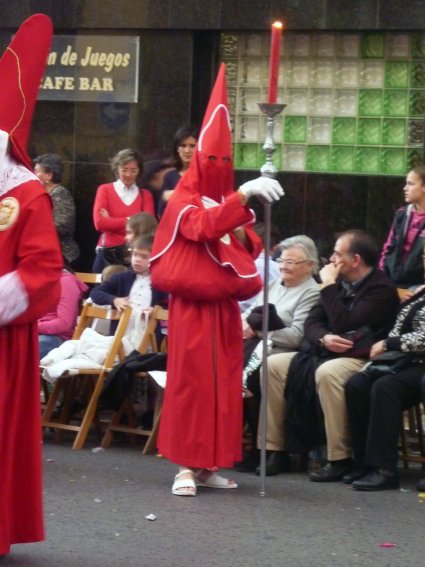 Pero lo más sorprendente, que hace que incluso la barroca Semana Santa andaluza parezca a su lado sobria, es la tradición secular de que los nazarenos vayan repartiendo a los asistentes caramelos, monas de pascua, huevos duros, habas o cualquier otro tipo de alimento, para lo cual utilizan el propio hábito a modo de improvisada faltriquera introduciendo la mano por el escote para sacar las dádivas. Dicen que esta costumbre arranca de siglos atrás, cuando los huertanos procedentes de las alquerías cercanas llegaban a pie a Murcia para participar en las procesiones, portando sus provisiones -entonces eran viajes largos- en el hábito. Posteriormente, ya en la procesión, intercambiarían las viandas entre ellos o, según otras fuentes, las donarían como penitencia por sus pecados. En cualquier caso, hoy en día resulta llamativo ver a los penitentes cargados con kilos y kilos de caramelos encima, lo que les proporciona un peculiar y achaparrado aspecto a modo de enorme botarga rodeándoles la cintura. Según me contaron, un intento realizado hace no mucho por un obispo para moderar esta tradición se encontró con un rechazo tan tajante por parte de las cofradías, que hubo de ser desestimado por el prelado.