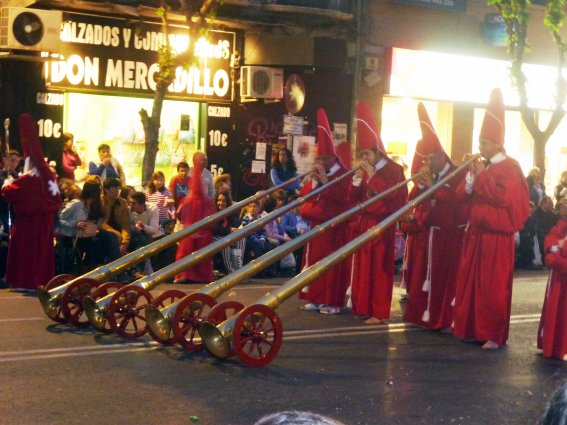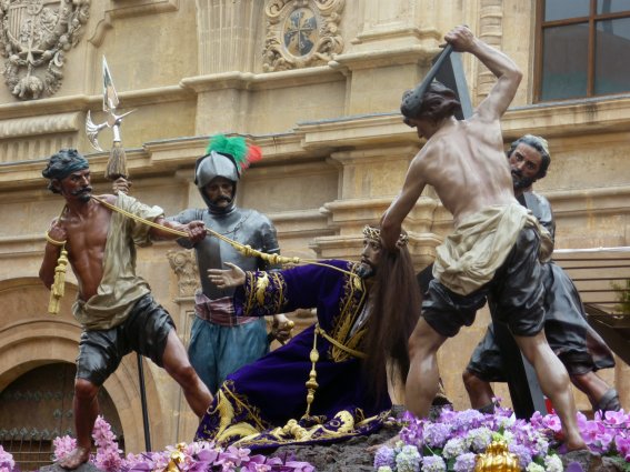 Pero existe además un tercer modelo, el murciano, con los suficientes elementos propios como para ser considerado original y no una simple copia -o mezcla- de los dos anteriores, razón por la que, movido por mi reciente visita a la recién acabada Semana Santa murciana, he decidido escribir este artículo apoyándome en mi propia experiencia personal. He de advertir, eso sí, que tan sólo estuve en Murcia capital, por lo que no puedo hablar de otras Semanas Santas tan importantes como la de Cartagena o Lorca, similares en importancia a la de la capital aunque en el último caso existen además unas representaciones bíblicas realmente impresionantes.