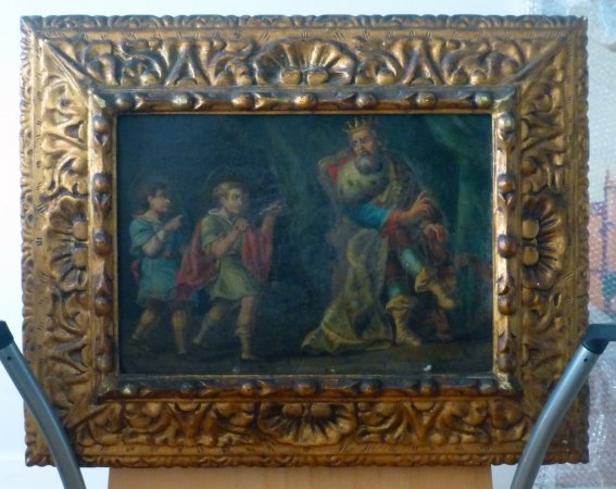 Otra institución complutense, la Sociedad de Condueños, adquirió en 2022 un cuadro que había salido a la venta en internet. Es de pequeñas dimensiones, aparentemente barroco, y representa a los Santos Niños acudiendo ante Daciano, el cual está ataviado de forma anacrónica a modo de rey medieval. Desconozco tanto su procedencia original como su autoría, y aunque su calidad pictórica no es excesiva, es de celebrar que, dada su temática, haya recalado en Alcalá.
