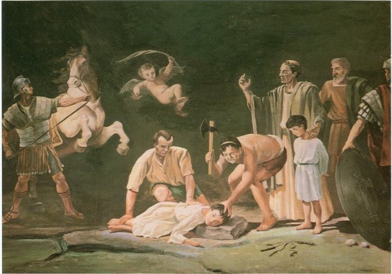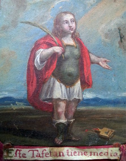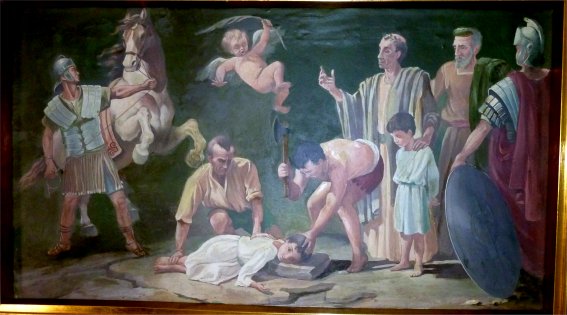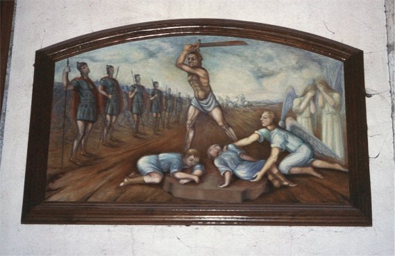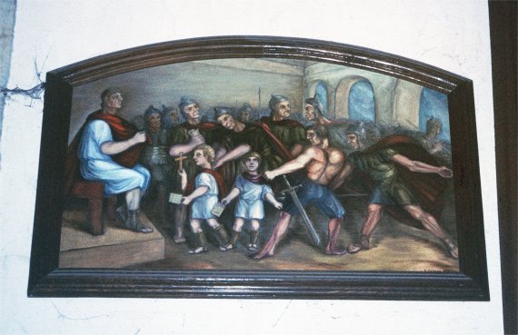 Conservo, eso sí, dos fotografías suyas, en las que como puede apreciarse se representan los dos episodios claves de la tradición, el testimonio de los niños ante el pretor Daciano y su posterior martirio mediante decapitación.