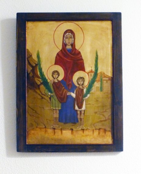 La parroquia de Nuestra Señora del Val, bajo la advocación de la patrona de la ciudad, es de fundación reciente y está ubicada en los bajos de un edificio de la avenida de Lope de Figueroa. Dentro de su iconografía se incluye este cuadro representado a los Santos Niños junto con una figura femenina que cabe identificar con su madre. El cuadro, del cual no he podido averiguar su autor puesto que no está firmado, recurre a un estilo que recuerda a los iconos bizantinos, aunque se trata de una obra moderna.