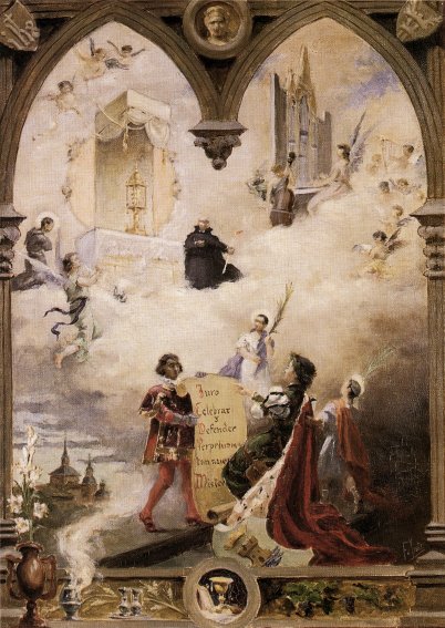 El primero de ellos, de pequeño formato (50 × 37 cm.) y fechado a finales del siglo XIX, está inspirado en el dibujo que realizó Félix Yuste en 1897, con motivo del tercer centenario de las Santas Formas, conmemorando el voto que en 1626 hizo Alcalá de celebrar y defender perpetuamente el milagro de su incorrupción, el cual hubo ocasión de contemplar en la exposición de 2018. En el cuadro2, así como también en el dibujo, aparece Alcalá simbolizada en una figura femenina, arrodillada frente a la custodia de las Santas Formas pronunciado su solemne voto mientras los Santos Niños le acompañan sosteniendo las palmas del martirio. Aparecen también en el cuadro, no así en el dibujo, san Diego y el jesuita padre Júarez, descubridor del carácter incorrupto de las veinticuatro Santas Formas.