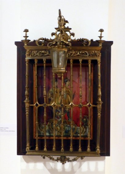Procedente de la colección de José Félix Huerta, en la exposición Justo y Pastor. Origen de una ciudad1, celebrada desde el 6 de marzo al 8 de abril de 2018 con motivo de la conmemoración del 450º aniversario de la reversión de las reliquias de los mártires complutenses, hubo ocasión de contemplar este oratorio pintado en 1899 por el artista alcalaíno Félix Yuste (1866-1950), un óleo sobre cartón al que posteriormente se le acopló una reja de bronce y un farol a modo de pequeña capilla u oratorio. Llama la atención que las figuras de los Santos Niños, inspiradas en las imágenes que existieron en la Magistral hasta su desaparición durante la Guerra Civil, sean prácticamente idénticas a las de una conocida estampa obra también de Félix Yuste, por lo que cabe suponer que esta última pueda ser una copia del cuadro.