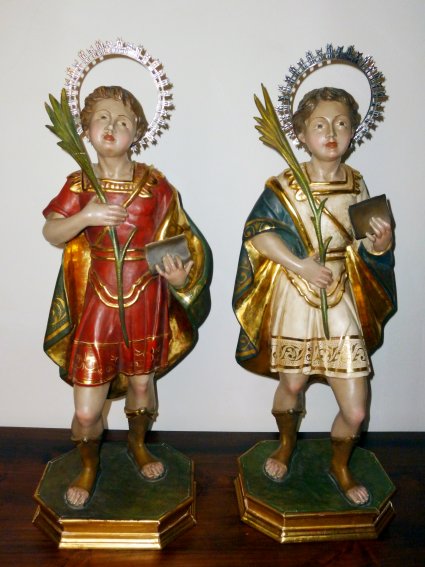 Iniciamos nuestro itinerario por los conventos complutenses realizando una primera parada en el el monasterio de las Carmelitas Descalzas de la Purísima Concepción, o Carmelitas de la Imagen, ubicado en la calle del mismo nombre. Se da la circunstancia de que hasta fechas muy recientes desconocía la existencia de imágenes de los Santos Niños en este convento, y fue gracias a un artículo de Luis Miguel García de Mora, Lumigarmo, publicado en el semanario Puerta de Madrid el 18 de diciembre de 2010 como tuve noticia de los mismos. Su autor fue el imaginero madrileño -con taller en la calle García de Paredes- Faustino Sanz Herranz, recientemente fallecido a los 87 años de edad, creador de importantes tallas religiosas como la Sagrada Cena de la catedral de Ciudad Real. Faustino Sanz talló a los Santos Niños en la década de 1990 siguiendo trazas clásicas, siendo también obra suya la imagen de la Virgen del Carmen que se conserva en la iglesia de este mismo convento. Los Santos Niños, por el contrario, se encuentran en el interior del cenobio y por lo tanto no son accesibles al público, lo cual no deja de ser una lástima ya que se trata de unas obras de notable valía. Como curiosidad, cabe apuntar que en las coronas de plata que rematan las cabezas están escritos sus respectivos nombres.