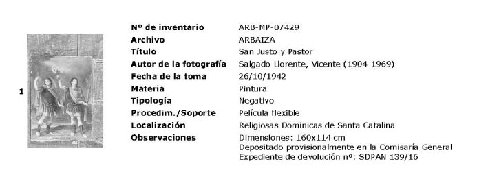 Éste es el caso del cuadro que nos ocupa, procedente según la ficha del convento de las dominicas de Santa Catalina de Siena. Fue fotografiado el 26 de octubre de 1942, fecha en la que estaba depositado provisionalmente en la Comisaría General con el expediente de devolución nº SDPAN 139/16, y cabe suponer que fuera devuelto a la comunidad en una fecha indeterminada posterior a la de la fotografía.