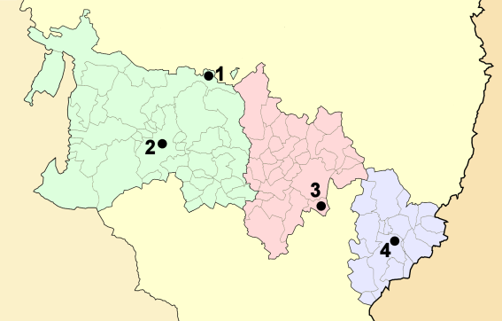 Sobrarbe (violeta), Ribagorza (naranja), Hoya de Huesca (rojo),
