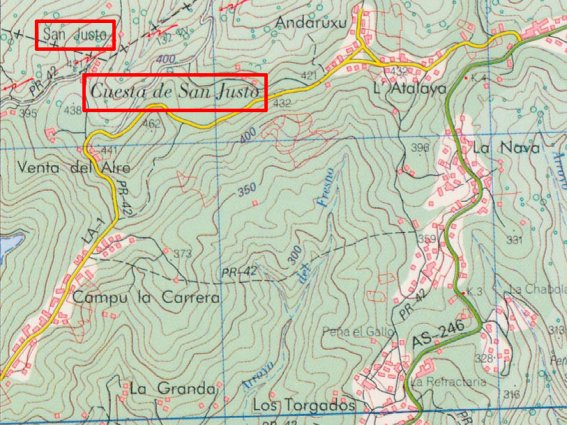 Apenas a kilómetro y medio de distancia en dirección este se encuentra la minúscula aldea de San Justo, perteneciente a la parroquia de Barros y ésta a su vez al municipio de Langreo, a la que el INE asigna un censo de cuatro habitantes. Dada su cercanía, cabe suponer que el topónimo de la aldea pasara al vecino cordal y también a la cuesta de San Justo, situada a unos centenares de metros en dirección opuesta.