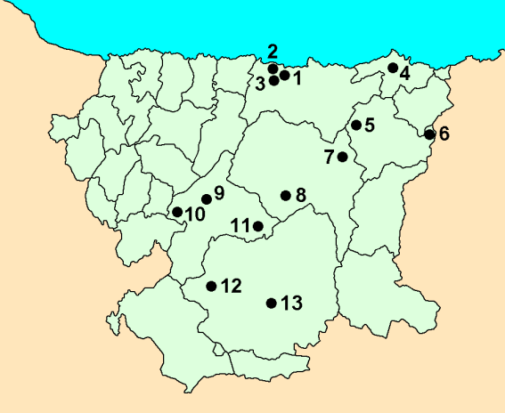 Dado el gran número de referencias que tengo localizadas en Asturias, cuarenta en total, he creído necesario dividir la provincia en varias partes, tal como he hecho en otras ocasiones, para facilitar su lectura y no perderse en los mapas. Para ello he seguido la división habitual del principado en tres zonas, la occidental, la central y la oriental, pero como la central acumulaba más de la mitad de las referencias, la he subdividido a su vez en otras dos, la costa cantábrica al norte y los Picos de Europa al sur.
