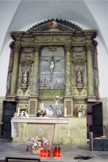 Lavio. Vista exterior de la parroquia y retablo |