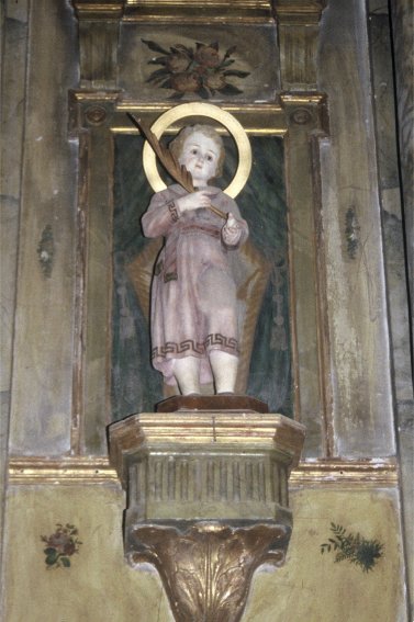 Efectivamente, fue así como me la encontré, con las imágenes de los Santos Niños en la parte que correspondería al ático en caso de haber existido un retablo, justo encima de la de San Agustín; eran de pequeño tamaño y por fortuna antiguas, probablemente barrocas. Estaban ataviadas a la romana y portaban los atributos habituales, las tablillas escolares y las palmas del martirio.