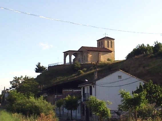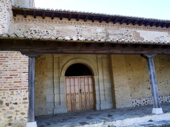 Como puede apreciarse, la iglesia antigua queda en alto y aislada del caserío, razón que supongo hubo de pesar en su día a la hora de trasladar de lugar la parroquia en lugar de restaurarla. Es de pequeño tamaño y su elemento más representativo, además de la maciza torre, es sin duda el nártex exterior que se abre a los pies, un elemento arquitectónico que, sin ser infrecuente, sí lo es el hecho de que esté acompañado por un pórtico lateral.
