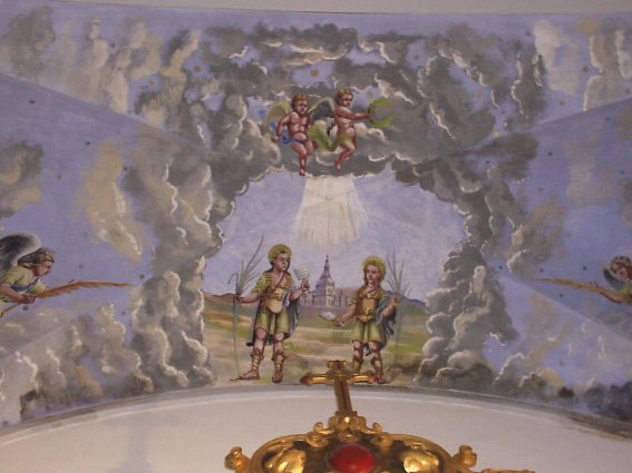 A ambos lados del beato se encuentran las hornacinas de los Santos Niños, dos buenas tallas en las que los mártires complutenses aparecen ataviados con túnica y manto (una indumentaria, por cierto, muy diferente a la usual en el imperio romano de principios del siglo IV) y tocados con unas coronas de laurel, mientras portan la palma del martirio en una mano y un libro abierto (otro curioso anacronismo) en la otra. No acaba aquí la iconografía de los titulares de la parroquia, puesto que en el arco toral situado sobre el testero del presbiterio hay pintada una escena más o menos copiada de un antiguo grabado alcalaíno en el que se ve a los Santos Niños y al fondo, como paisaje, una escena con las torres de la ciudad de Alcalá.