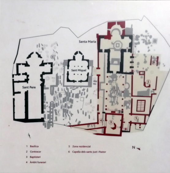 Catedral de tres naves con columnas, pavimentada con opus signinum -fragmentos de piedra mezclados con argamasa y apisonados- con ábside cuadrado al exterior y el interior decorado con pintura mural. Transepto y naves con enterramientos. Contracoro con tumba devocional centrada. A los pies del edificio se encontraba el baptisterio, con piscina central donde se celebraba la ceremonia del bautismo por inmersión, con desagüe a un pozo y un lavatorio. Al norte, un recinto funerario para los no bautizados y los niños fallecidos sin uso de razón. Al sur, zona residencial, patios de galería cubierta y una capilla bajo la advocación de los santos Justo y Pastor.