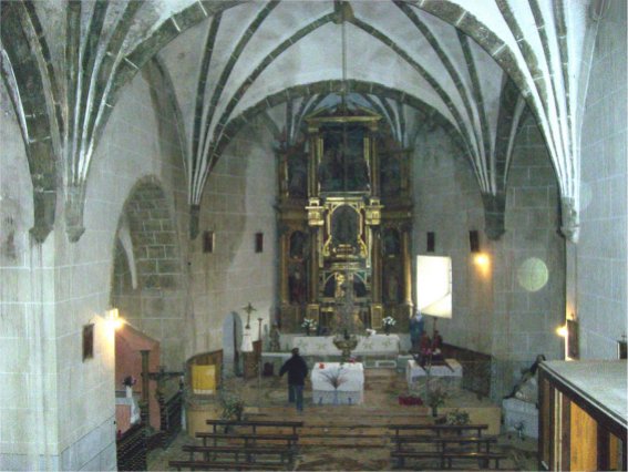 El interior de la iglesia, tal como se describe en la ficha, es de una nave, con capillas laterales y bóveda gótica. El retablo mayor, manierista -es decir, de transición del renacimiento al barroco-, recuerda en sus trazas a algunos de los existentes en las iglesias alcalaínas, en especial a los que el Hermano Bautista talló para las iglesias de las Bernardas y Jesuitas, aunque la forma del ábside condiciona sus dimensiones y su disposición.