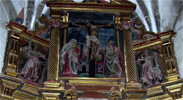 Cuenta con un cuerpo central y dos laterales, más estrechos y formando ángulo, pero lo más interesante para nosotros son sin duda las dos tallas de los Santos Niños, posiblemente relieves, que aparecen en los áticos de los dos cuerpos laterales, flanqueando el Calvario que remata el retablo. Presumiblemente contemporáneas del retablo, estas dos imágenes van ataviadas a la romanacon túnicas largas, al tiempo que portan como atributos sendas palmas de martirio y libros para resaltar su condición de escolares.