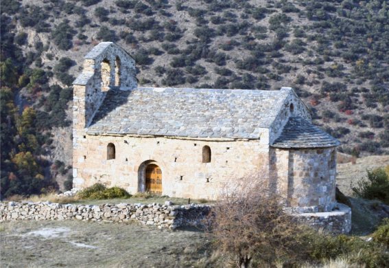Pequeña iglesia de una sola nave cubierta con bóveda de cañón y ábside semicircular, construida en mampostería y sillar. El ábside está decorado con una arquería ciega, con la base adornada con cruces blancas indicando la existencia de un cementerio anejo. La iglesia, consagrada a los santos Justo y Pastor, fue reformada en los siglo XIII o XIV ampliándose la nave hacia el oeste, abriéndose una capilla en la pared norte. La puerta sur fue condenada, sustituyéndose por la puerta actual. Cuenta además con un campanario, que data de la misma época de la fachada occidental. En su interior albergaba importantes murales, pero durante el siglo XX fueron arrancados y vendidos. Recuperados en 1994, actualmente se conservan en el Hospicio de Ille-sur-Têt.