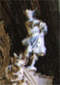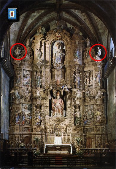 Recientemente compré en internet una postal que reproduce una fotografía del retablo mayor, en la cual procedí a buscar unas imágenes que pudieran corresponder a los mártires complutenses... y creí encontrarlas, aunque la resolución original no permite, al ampliar la fotografía, observar con suficiente nitidez los detalles. No obstante, las dos figuras que aparecen rematando las columnas laterales, justo por encima de los balcones, parecen representar a dos muchachos -su altura es inferior en una cabeza a las de los santos adultos situados bajo ellos y en los intercolumnios- ataviados con la indumentaria romana -túnica corta, peto militar, capa y botas altas- que tan frecuente resulta en su iconografía. Ciertamente puedo equivocarme y tampoco he conseguido confirmarlo, pero mis sospechas son lo suficientemente fuertes como para reproducirlas aquí pese a la falta de resolución.