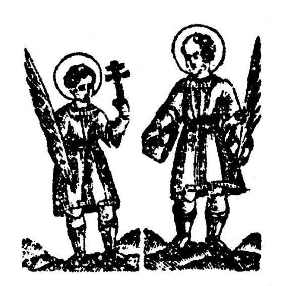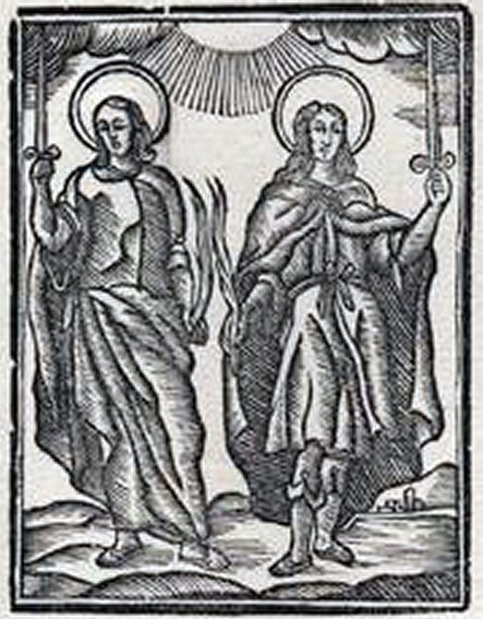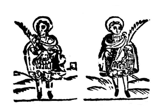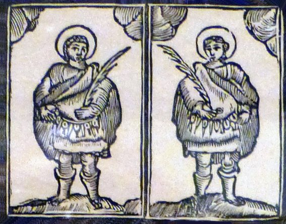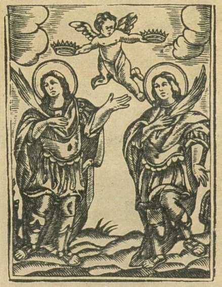 Comencemos con los de Barcelona. Los más antiguos son los de 1652 y su ilustración resulta ser un tanto esquemática, aunque en ella aparecen todos los atributos típicos de los mártires complutenses.