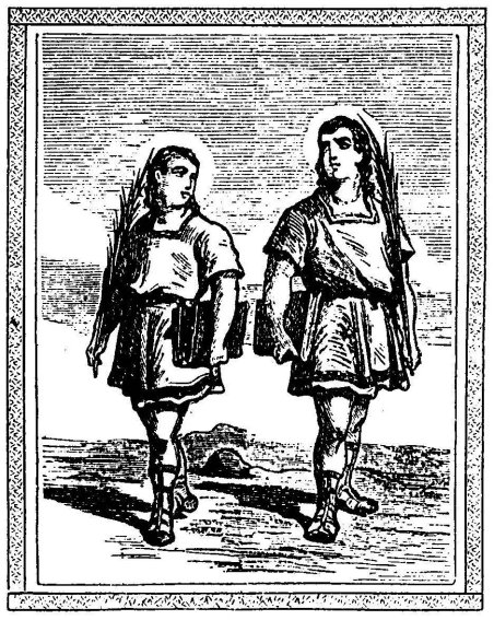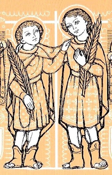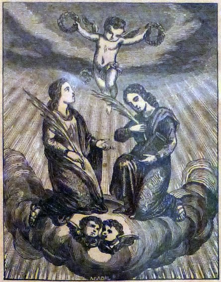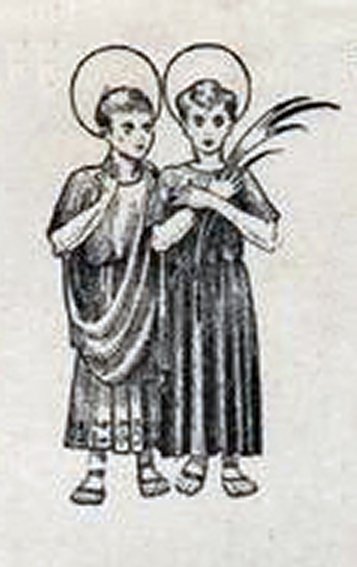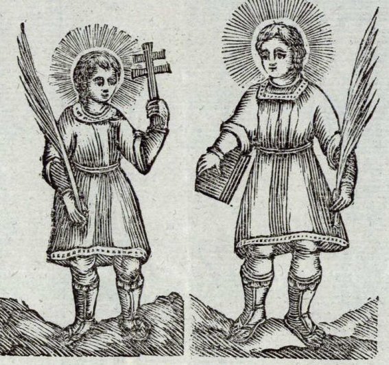 De finales del siglo XIX son los Goigs que reproducen este grabado de estilo decimonónico en el que aparecen unos Santos Niños más crecidos de lo habitual, ataviados con túnicas largas en lugar de con indumentarias militares. Ambos están arrodillados sobre una nube, y sostienen en las manos las palmas del martirio mientras un ángel desciende del cielo posando sobre sus cabezas sendas coronas martiriales. Conozco dos versiones idénticas de este dibujo, una la de los Goigs y la otra impresa en la portada de un pequeño folleto de la parroquia de Barcelona.