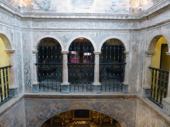 Camarín de las reliquias. Arriba, bustos de los Santos Niños. Abajo, frescos pintados en el muro |