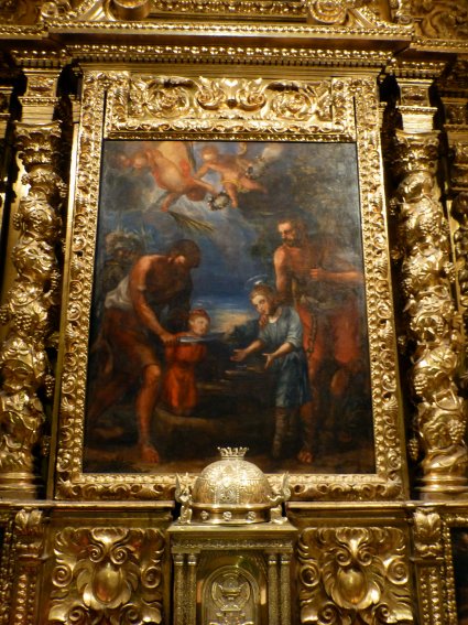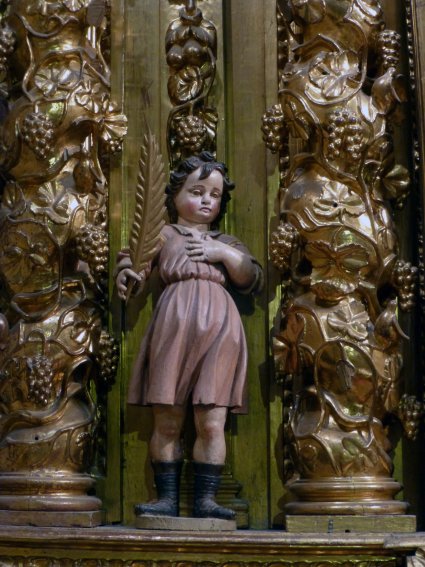 Los relieves de los Santos Niños corresponden a las dos basas centrales de las columnas salomónicas, y flanquean al relieve de san Lorenzo. Los dos hermanos, por cierto, presentan un aspecto bastante poco infantil.