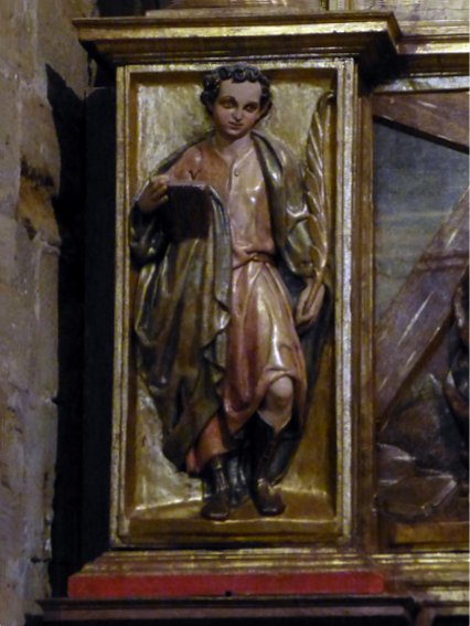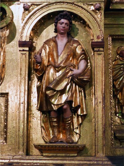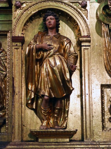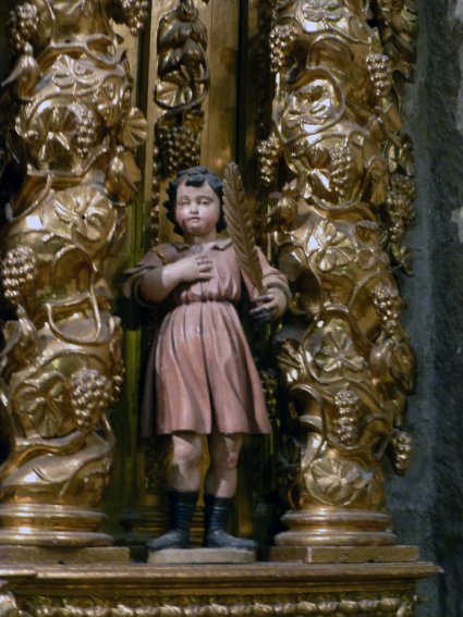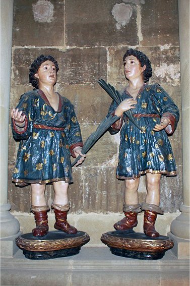 Yendo ahora al presbiterio, tendremos ocasión de contemplar otras dos representaciones de los Santos Niños, en esta ocasión unos relieves de la predela del retablo que sirven de basa a las dos columnas de los extremos. Fechado en 1602, es obra de Juan de Berrueta y Juan de Alli.
