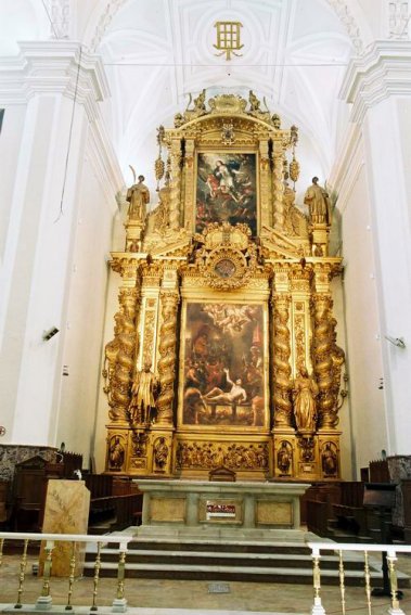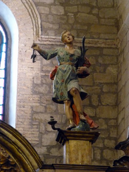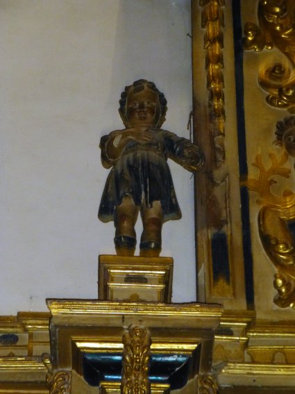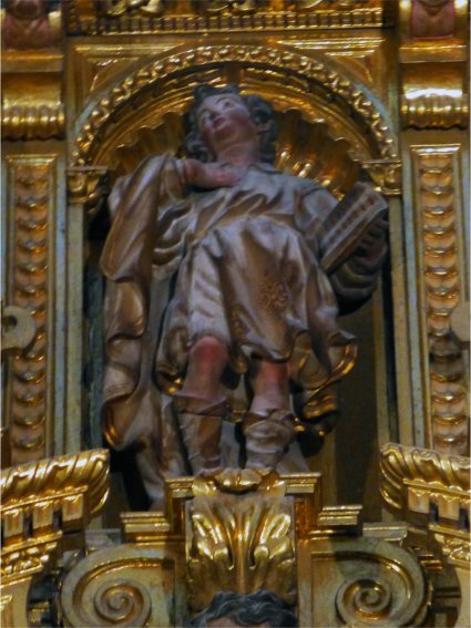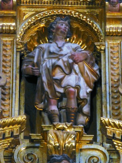 La iglesia de Santo Domingo y San Martín fue en su origen la capilla de un convento dominico exclaustrado en el siglo XIX, del cual desaparecieron todas sus dependencias a excepción de la iglesia, hoy convertida en parroquia. Es un edificio barroco que cuenta con un importante patrimonio artístico, pero lo que a mí me llamó la atención fueron las dos pequeñas imágenes colocadas en la cornisa de uno de los retablos, concretamente el de Pentecostés, situado en el lado del Evangelio frente al crucero.