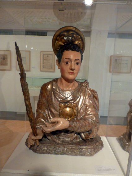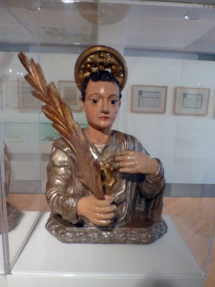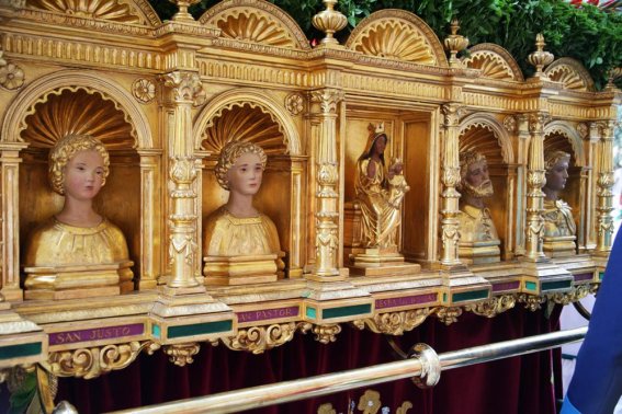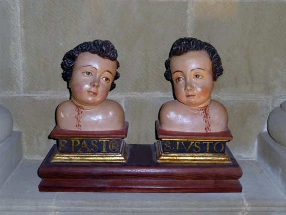 No acaba aquí la presencia de los Santos Niños en el templo oscense. Retornando al camarín de las reliquias nos encontramos con otros dos bustos de los mártires complutenses tallados en madera plateada y policromada en el siglo XVIII. Cuando yo los vi, en el verano de 2017, estaban necesitados de una restauración, pero gracias la cooperación entre las diócesis de Huesca y Alcalá, con motivo de la celebración del 450º aniversario de la Reversión de las reliquias ambos bustos fueron restaurados y exhibidos en la exposición Justo y Pastor. Origen de una ciudad1 celebrada en Alcalá en marzo de 2018.