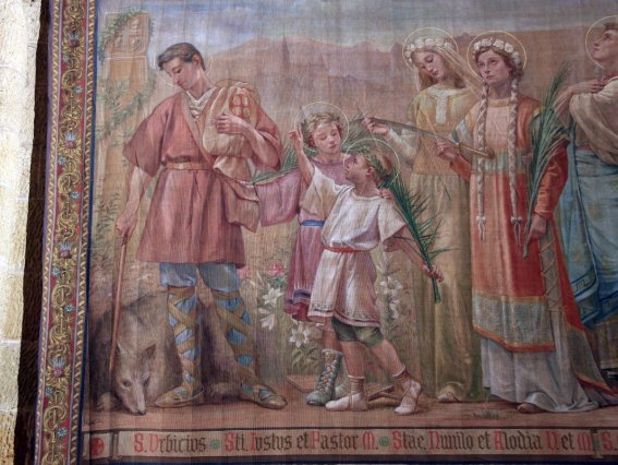 Los Santos Niños aparecen en la parte delantera del lienzo situado a la derecha, entre san Urbez -representado como pastor tal como es habitual- y las santas Nunilo y Alodia, dos hermanas vírgenes martirizadas en el siglo IX durante la dominación musulmana. La estética es la típica de la época, quizá con ciertas reminiscencias prerrafaelistas, estando ataviados los hermanos con túnicas cortas y -curioso anacronismo, puesto que se trata de una prenda de origen medieval- calzas hasta las rodillas. Ambos portan coronas de laurel y las palmas del martirio, y el mayor, Pastor, atiende a lo que le dice su hermano Justo.