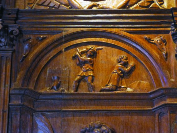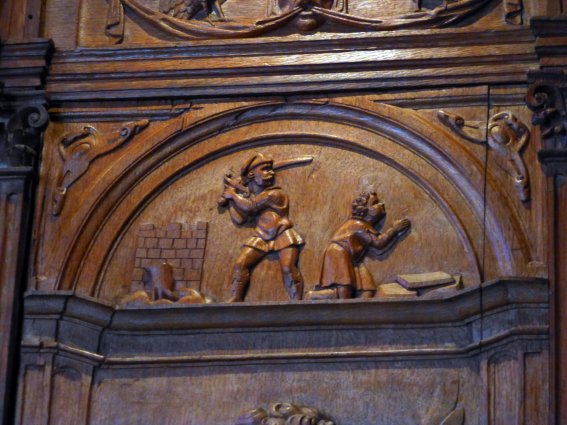 También para la Catedral, y más concretamente para la sillería del coro, se realizaron sendos relieves de los dos hermanos, ambos contiguos, en los que aparecen representados con atavíos de colegiales del siglo XVI y portando en las manos la palma del martirio y un libro, anacronismo muy habitual en sus representaciones iconográficas. Los relieves, correspondientes a los respaldos de los sitiales, están rematados por unos áticos semicirculares en los que se representan las escenas del martirio.