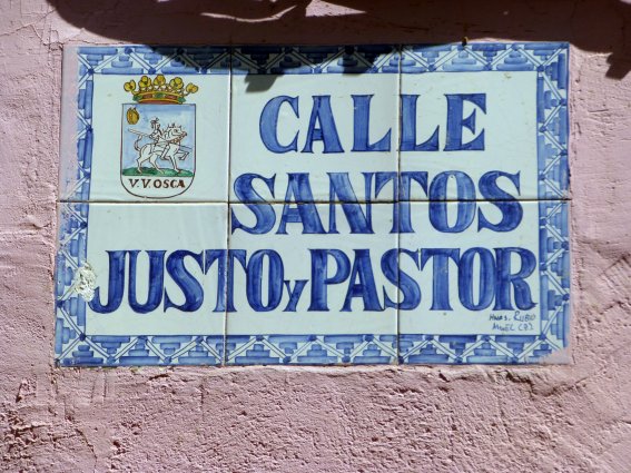 A modo de colofón, nos encontramos por último con la calle que Huesca tiene dedicados a los Santos Niños, situada en las cercanías de San Pedro el Viejo. Discurre entre la plaza de los Fueros de Aragón y la calle Desengaño. Se trata de una vía estrecha de claro trazado medieval, y según una placa informativa fue antiguamente, bajo el nombre de Carrera das Tablas Altas, sede de las carnicerías que dieron nombre al barrio hasta el siglo XIX. En el tramo final de la calle se encontraba una Encomienda del Temple que, tras la extinción de la orden, fue entregada a los Hospitalarios de San Juan de Jerusalén, de la que es sucesora la actual Orden de Malta.