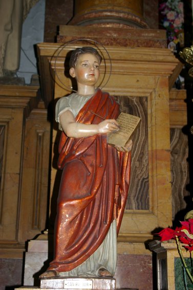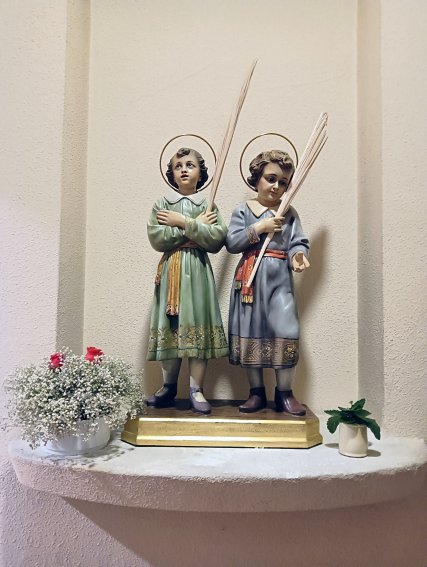 En la primera de las hornacinas de la galería del lado del Evangelio -el de la izquierda teniendo el presbiterio de frente-, vecina a la puerta de la sacristía, me encontré en abril de 2025 con unas imágenes de los Santos Niños que yo nunca había visto antes, pese a conocer este templo desde hacía bastantes años. Consultado el párroco éste me informó que la parroquia las conservaba desde hacía mucho tiempo, pero habían permanecido guardadas en la sacristía por falta de espacio hasta que tras una remodelación del interior del templo, posiblemente relacionada con la conmemoración del cuarto centenario del fallecimiento de la beata, volvieron a ser colocadas en la nave de la iglesia.