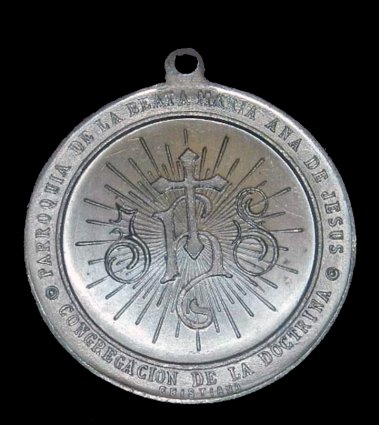 Su presencia en la parroquia viene a aclarar, al menos parcialmente, un pequeño enigma que me tenía intrigado desde hacía bastante tiempo, la existencia de una medalla lo suficientemente antigua como para que los párrocos actuales no supieran darme noticia de ella, que vinculaba a ésta con los Santos Niños. Es de aluminio y está claramente inspirada en una alcalaína cuyo anverso reproduce representando a los Santos Niños rodeados por una orla. En el reverso aparece el monograma JHS con la cruz inscrita en la letra central que representa el nombre de Jesucristo, rodeado por una orla con las frases Parroquia de la Beata María Ana de Jesús y Congregación de la Doctrina Cristiana. En cuanto a su datación evidentemente ha de ser posterior a la creación de la parroquia, aunque no me ha sido posible fijar una fecha siquiera aproximada.
