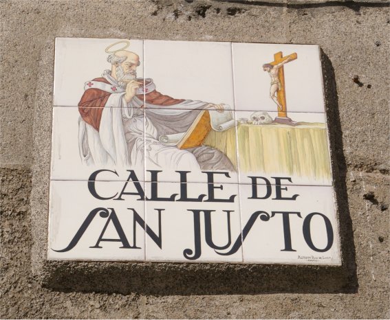 Otra faceta de este estudio sobre la fecunda relación de nuestros patronos con Madrid es su presencia en el callejero madrileño. Existe una calle de San Justo, la cual tiene su inicio en la Puerta Cerrada y es continuada por la del Sacramento; puesto que en ella se alza la antigua parroquia de San Justo, es decir, la actual Basílica Pontificia de San Miguel, es inmediato concluir que el nombre de la calle se debe a la parroquia, habiéndolo mantenido incluso después del traslado de la misma al barrio de Malasaña. Eso sí, el rótulo de la calle que fotografié cuando escribí la primera versión de este artículo, allá por 1998, y que representaba al niño mártir que le daba nombre, fue sustituido en fecha indeterminada, anterior a la actualización que realicé en 2007, por el actual, que representa a un santo anciano que por razones obvias no puede ser nuestro san Justo; está claro que el responsable del tema no anduvo lo que se dice demasiado acertado.