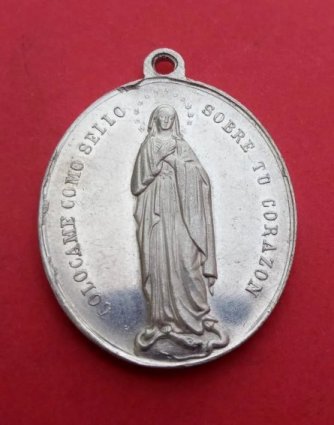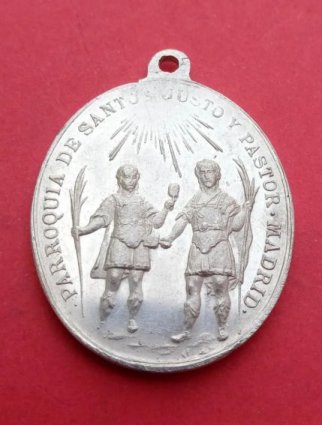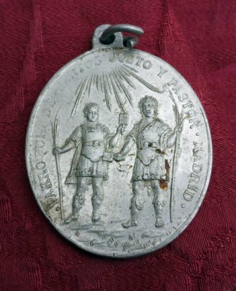 A título de curiosidad, cabe reseñar por último la existencia de una medalla acuñada por la parroquia de los Santos Justo y Pastor de Madrid. En el anverso aparecen las figuras de los dos mártires, copiadas al parecer del conocido grabado renacentista que tantos motivos iconográficos ha inspirado o, más probablemente, de la medalla acuñada en Alcalá en 1897 en conmemoración del tercer centenario de las Santas Formas. El reverso reproduce una imagen de la Inmaculada junto con la leyenda Congregación de las Hijas de María. Aunque no he podido datarla, cabe suponer que debió de ser realizada durante su presencia en esta iglesia.