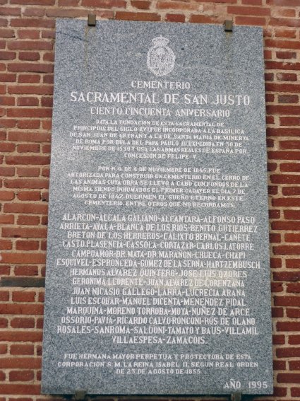 Sacramental de San Justo. Lápida situada a la entrada del recinto (izquierda) y lápida conmemorativa del 150º aniversario (derecha) |