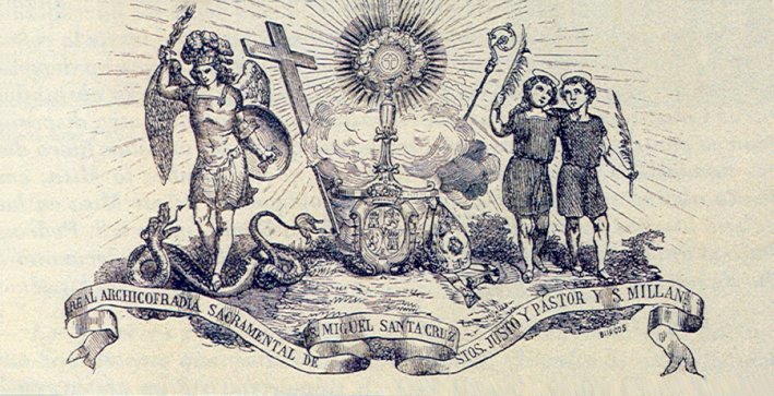 La Real e Ilustre Archicofradía Sacramental de San Miguel, Santa Cruz, Santos Justo y Pastor y San Millán se formó por la fusión de tres antiguas cofradías sacramentales: La de San Miguel, la de San Justo y Pastor y la de San Millán, las cuales hunden sus raíces en el siglo XVI. Estas cofradías tenían entre sus misiones la de dar sepultura a sus cofrades, aunque lógicamente no lo hacían en el cementerio actual por no haber sido éste construido todavía. Es bastante probable que estos tres cuadros procedan de estas cofradías, como parece indicar el hecho de que en ellos aparezcan representados los Santos Niños y san Millán en su advocación de Matamoros, similar por cierto a la de Santiago; recordemos que la iglesia de San Millán, antes de ser parroquia independiente, dependía de la de San Justo.