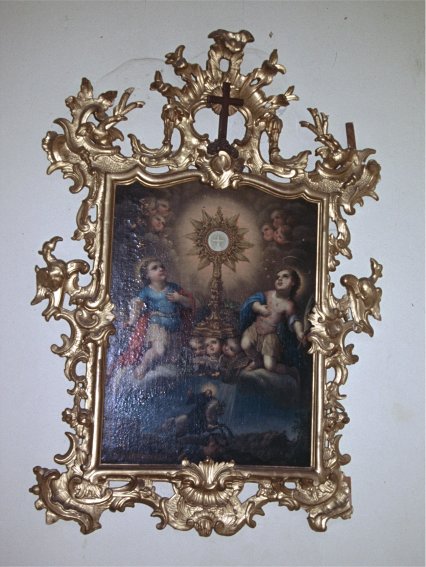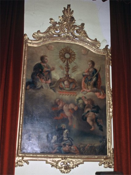 Pero lo más importante para nosotros es la existencia de hasta tres cuadros distintos, todos ellos con una iconografía muy similar, representando a los Santos Niños junto con san Millán y la custodia del Corpus Christi. Cuando visité el cementerio por vez primera en octubre de 1995 uno de ellos se encontraba en la capilla y el segundo en un lugar del que no tomé nota, quizá a la entrada, mientras no me fue posible localizar el tercero, que aparecía reproducido en el libro de Juan Antonio Pino3. En una segunda visita realizada en julio de 2012 no encontré a ninguno de los dos primeros -la capilla había sido remodelada por completo- pero sí el tercero, colocado en el vestíbulo de entrada al patio de San Miguel. Según me informaron en las oficinas los cuadros fueron trasladados a otro lugar, posiblemente el museo diocesano inaugurado en abril de 2007 en la catedral de la Almudena, aunque por el momento no me ha sido posible comprobarlo.