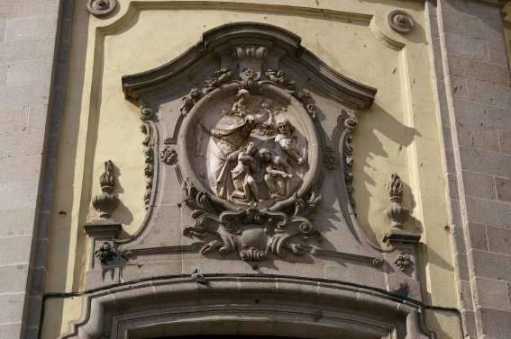Existió también un cuadro de grandes dimensiones, pintado por José del Castillo, representando a los Santos Niños ante Daciano, pero éste fue sustituido por el actual de San Miguel e ignoro cual ha podido ser su paradero, aunque un boceto del mismo se conserva en el museo Lázaro Galdiano. La fachada exterior no es plana, sino convexa, debido a la estrechez del terreno que ocupa la iglesia. Sobre la puerta de entrada se alza un medallón que recuerda el martirio de los dos mártires, y en el cuerpo superior campea el escudo de armas del cardenal infante. Cuatro estatuas dedicadas a la Fe, la Esperanza, la Caridad y la Fortaleza, y dos pequeñas torres completan la decoración de la fachada.