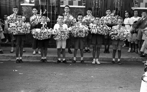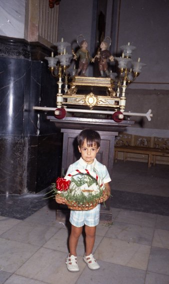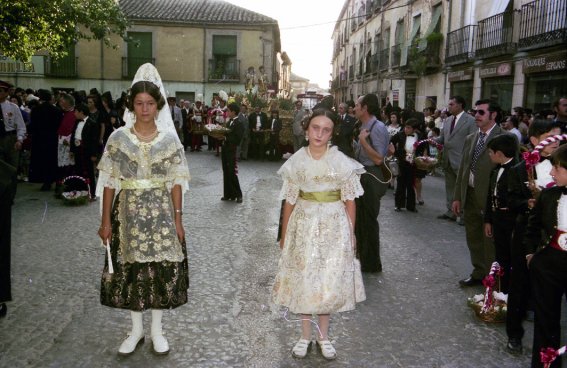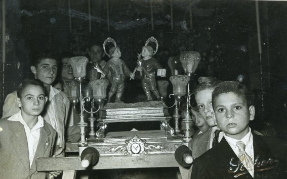 Ya por la tarde, la delegación manisera procedería a prepararse para su participación en la misa y la posterior procesión, con los niños-clavarios (copio del artículo citado) ataviados con el traje típico valenciano, con el fajín y escudo con las imágenes de los santets, y las niñas asimismo de valencianas, portando los tabacs y la Rosa. Terminada la misa depositaron una corona de laurel en la cripta, y acto seguido ofrecieron el Tabac y la Rosa a las autoridades allí presentes. Por último, intervinieron en la procesión escoltando la carroza que llevaba las imágenes de los patronos comunes. Aunque el artículo incluye una interesante fotografía con los niños-clavarios precediendo a la carroza, con las cestas de los tabacs sujetas con ambas manos, a su paso por la calle de Escritorios, de vuelta ya a la Magistral, la escasa calidad de la misma hace imposible su reproducción aquí, aunque sí lo hago con otras dos tomadas entonces, una en la Magistral durante la ceremonia religiosa y otra, en la plaza de los Santos Niños, ya en la procesión. En cualquier caso, se trató de un acontecimiento único el cual, que yo sepa, no se ha vuelto a repetir desde entonces.