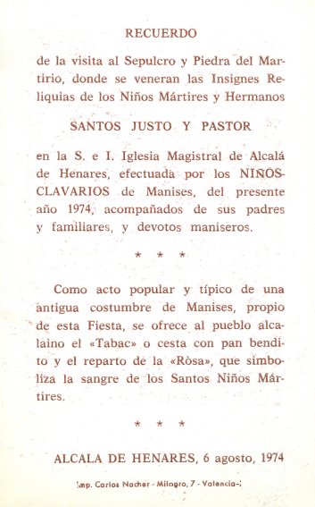 Es muy poco conocido que en 1974 la celebración de la procesión de los Santos Niños en Alcalá contó con la participación de un nutrido grupo de peregrinos maniseros llegados a la ciudad en dos autobuses, lo que permite calcular su número en alrededor de unas cien personas. Uno de los visitantes fue José María Moreno Royo, entonces director correspondiente del Centro de Cultura Valenciana, el cual escribió una crónica del viaje que fue publicada en dos números consecutivos -los correspondientes al 1 y el 8 de septiembre- de la hoja parroquial Aleluya, y reeditada justo un mes más tarde, el 1 de octubre de 1974, en el número 32 del boletín municipal Manises.