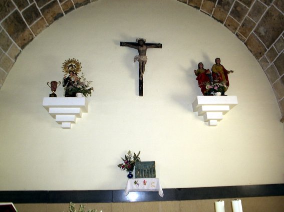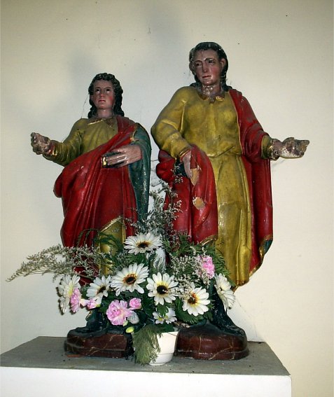 Como puede apreciarse, éstas se encuentran en el testero del altar mayor -no existe retablo- flanqueando a un crucifijo mientras al otro lado, en una peana gemela se alza la imagen de la Virgen del Carmen. Son, aparentemente, barrocas, y representan a unos hermanos quizá demasiado crecidos -en especial el mayor, ya que la diferencia de tamaño entre ambas es notable- ataviados a la romana, con túnica y capa larga. Aunque ambas imágenes han perdido los atributos habituales -las tablillas escolares y las palmas del martirio-, por la posición de los brazos se aprecia que éstos debieron existir.