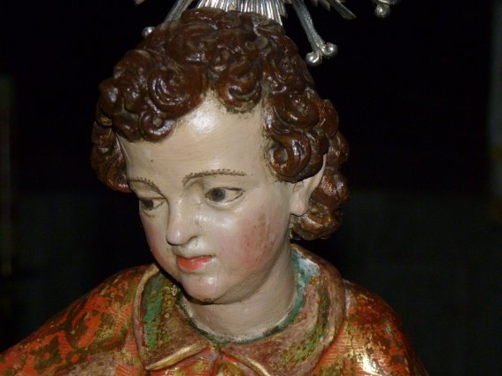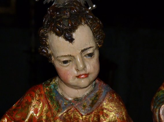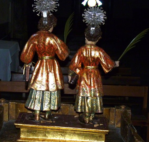 Las imágenes de los titulares del templo se veneran en el retablo mayor, y según las fotografías proporcionadas por Justo Martínez parecen ser barrocas, representando a los niños con aspecto infantil -nada que ver con los espigados mocetones de otros lugares- ataviados con unas túnicas más de aspecto talar que romano. Ambas imágenes portan en la mano derecha las palmas del martirio y en la izquierda, en flagrante anacronismo, sendos libros en lugar de las tablillas escolares de su época. Según se puede apreciar en la fotografía de la procesión son de pequeño tamaño, y parecen estar policromadas y estofadas.