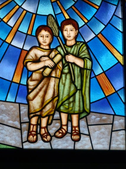 Desde el año 2008, aunque yo no lo supe hasta hace muy poco, la iconografía de los Santos Niños en la provincia de Madrid, y más concretamente en la diócesis de Alcalá, se ha visto incrementada con la vidriera existente en la parroquia de San Marcos de Rivas-Vaciamadrid. Yo tuve noticia de su existencia, como suele suceder a menudo, por casualidad. El presidente de la Asociación Diocesana de los Santos Justo y Pastor, Miguel Ángel López Roldán, me envió unas fotografías de la llegada a Rivas, el pasado 18 de diciembre de 2016, de las reliquias de los Santos Niños en el recorrido que estaban haciendo por las parroquias de la diócesis. Se pueden imaginar cual no sería mi sorpresa al descubrir la vidriera en el fondo de las fotos; me puse en contacto con la parroquia, que cuenta con una excelente página web, y hablé por teléfono con el párroco, don José Antonio Patallo Sanz, quien me atendió con total amabilidad invitándome a visitar la iglesia con objeto de que yo mismo pudiera fotografiarla. Cosa que, por supuesto, hice.