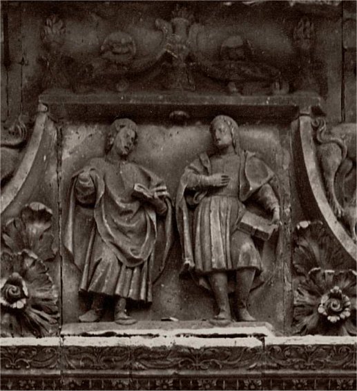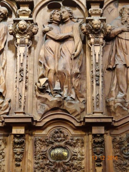 Montserrat tuvo más suerte que yo y, gracias a su amabilidad, puedo disponer de la fotografía que reproduzco, en la cual se aprecia que los dos mártires han sido representados en un único respaldo de sitial, abrazados y vistiendo, en curioso anacronismo, los hábitos universitarios de la época en la que fue construido el coro, entre 1710 y 1733 según trazas de Joaquín Benito y Alberto de Churriguera. Puesto que fueron varios los escultores que realizaron las tallas no me ha sido posible determinar su autor, aunque de su calidad no cabe la menor duda y de su identidad tampoco, ya que sus nombres aparecen escritos en el medallón situado debajo de las imágenes.