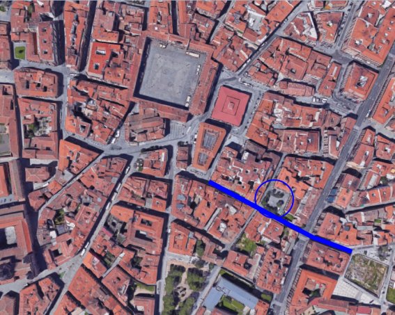 tomada de Google Maps. En azul la calle (línea) y la plaza